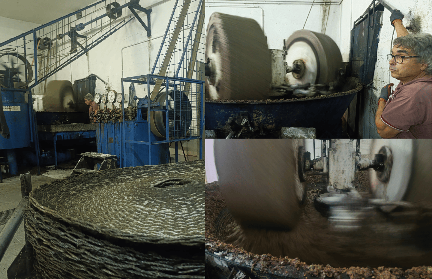 “95% do azeite está na polpa, 5% está no caroço, e o objetivo da moenda é esmagar a azeitona para ter acesso às microgotinhas que tem lá dentro”, elucida Carlos Filipe.