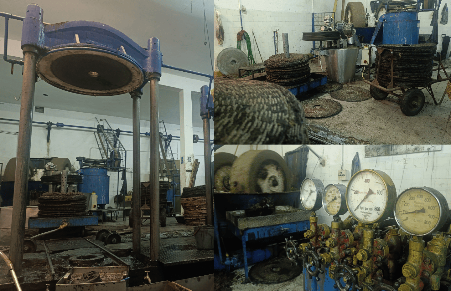 Procede-se ao empilhamento das seiras para levar à prensa, onde a massa é novamente esmagada e se dá o início formal à extração daquilo que virá a ser o ouro líquido. Cada prensa leva, em média, 30 seiras.